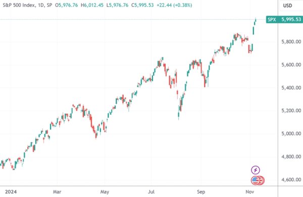 昨夜今晨,美股市场继续伴随着“特朗普红色浪潮”走高,虽然从走势来看上涨动能有些减弱,但并不妨碍三大指数齐创历史新高。 截至周五收盘,标普500指数涨0.38%,报5995.54点,日内一度首次站上6000点关口。根据统计,这是该指数今年第50次创收盘历史新高。 (标普500指数日线图,来源:TradingView) 纳斯达克指数上涨0.0...